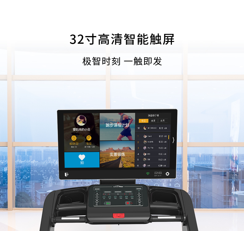 T7X Pro智能商用跑步機(jī)采用醒目的32寸超大高清觸控顯示屏+LED視窗,緊跟當(dāng)下大屏幕的流行趨勢。而且經(jīng)過測試研究,這是最適合人眼觀看的尺寸,178度的可視角度,能從不同點(diǎn)位看到屏幕顯示,避免誤操作的同時(shí)提升用戶感受。