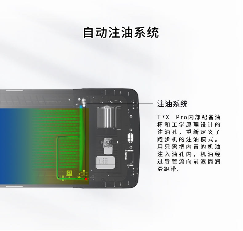 內(nèi)部配備油杯和工學(xué)原理設(shè)計(jì)的注油孔,重新定義了跑步機(jī)的注油模式。用只需把內(nèi)置的機(jī)油注入油孔內(nèi),機(jī)油經(jīng)過導(dǎo)管流向前滾筒潤滑跑帶。
